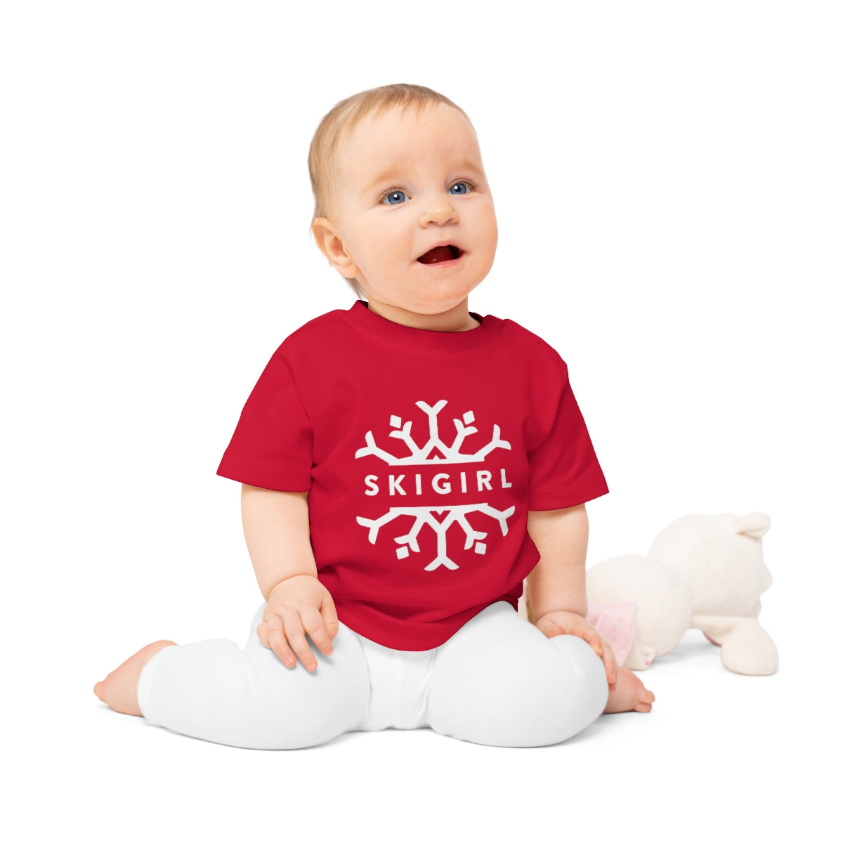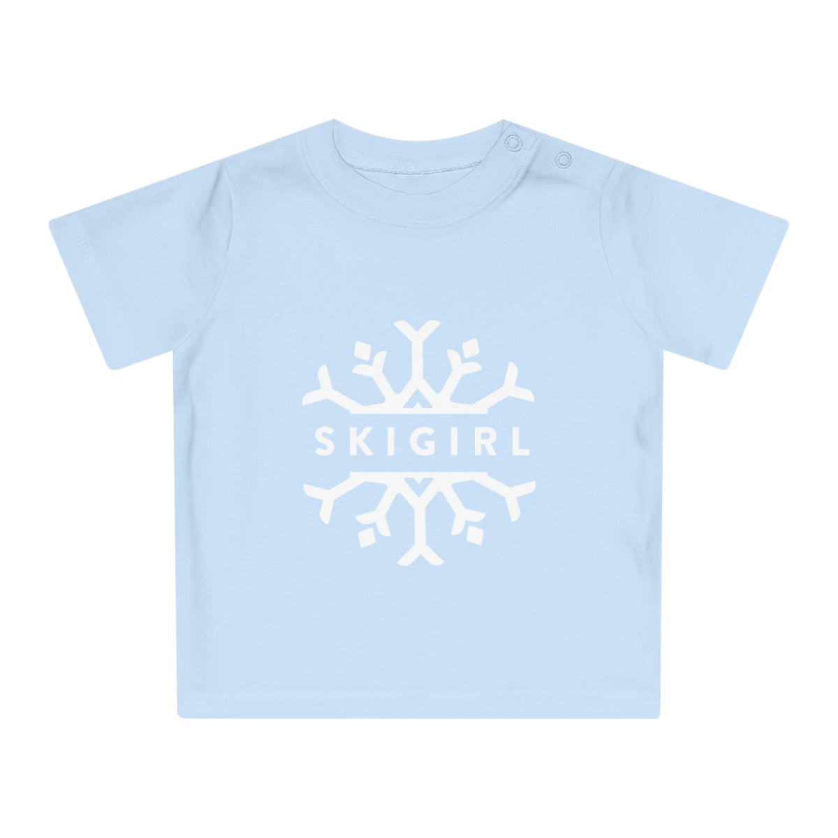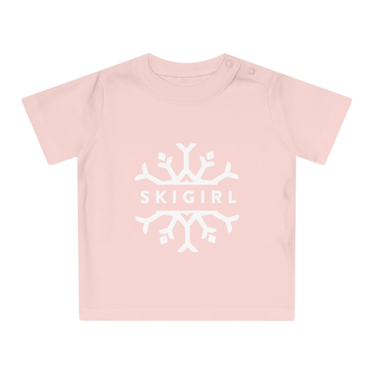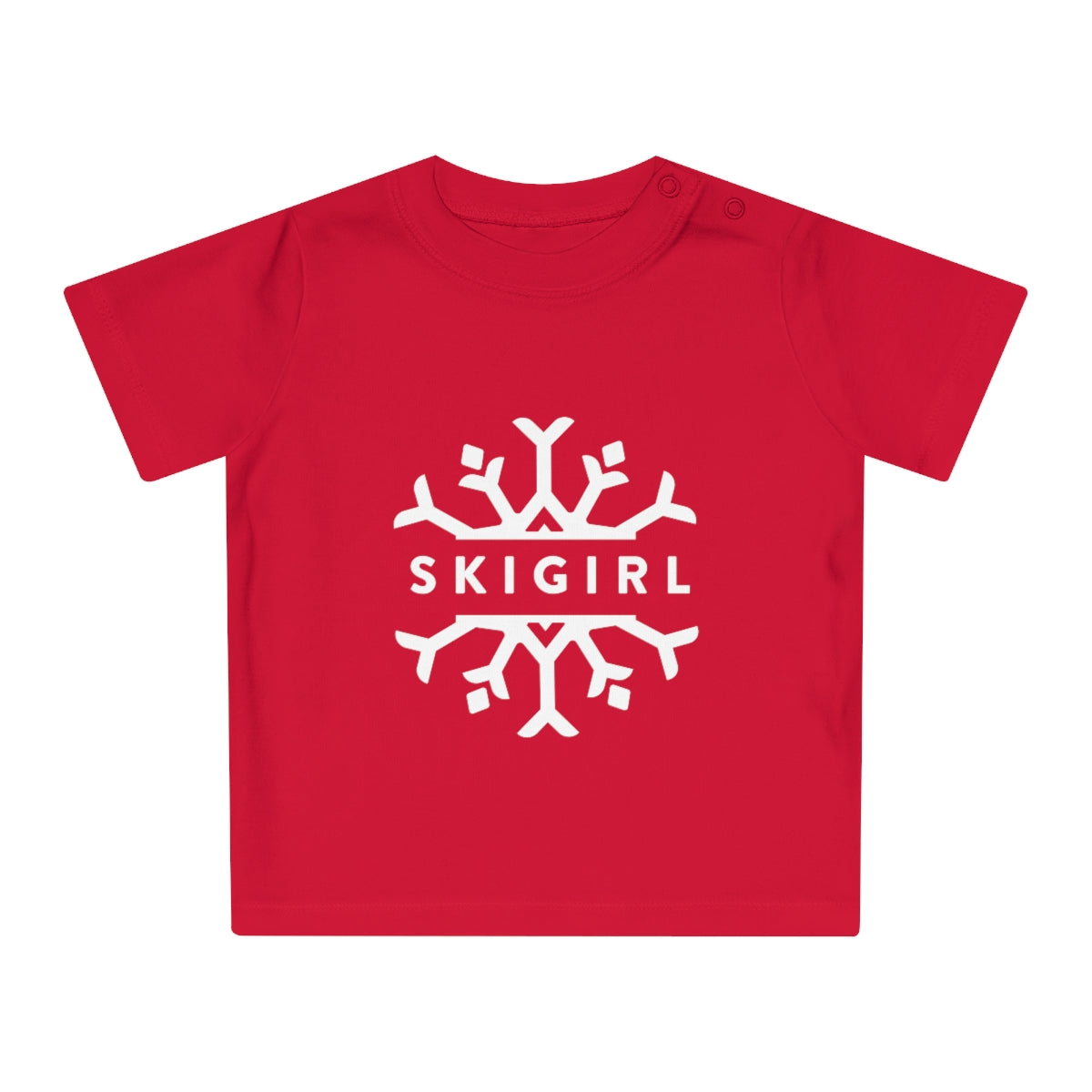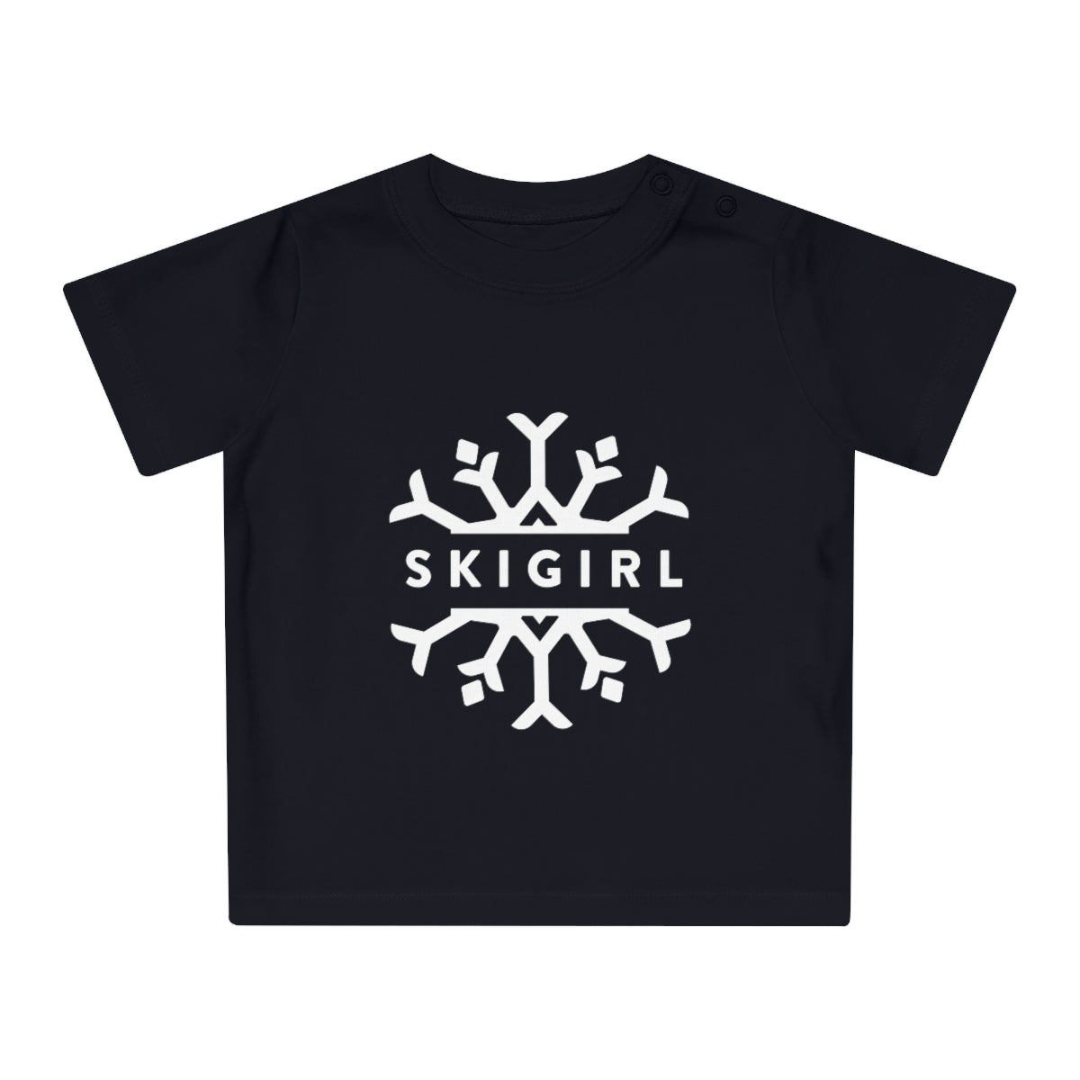 This Skigirl baby tee brings both comfort and style to the table. Made with 100% certified organic cotton these baby tees are delicate to the touch and excellent for sensitive skins. With colored snaps at the side neck.